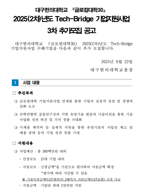 ★대구한의대학교 글로컬대학30 「2025(2차)년도 Tech-Bridge 기업지원사업」 3차 추가모집 공고문_250922.hwp